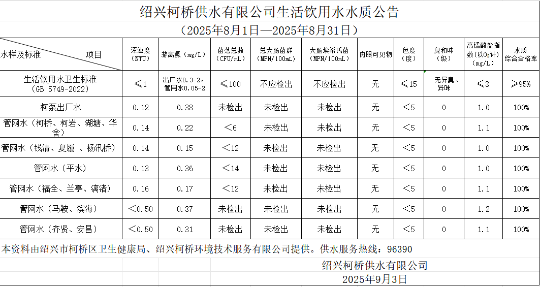 生活飲用水水質公告(2025年8月1日—2025年8月31日)