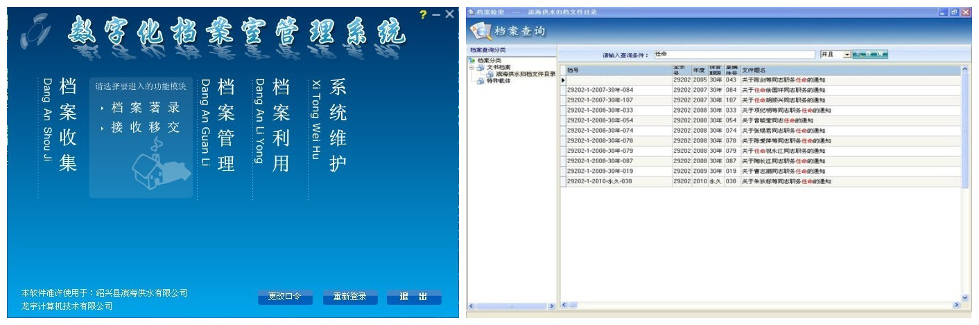 今年年初以來,在縣檔案局指導(dǎo)下,濱海供水公司檔案工作有了較大提高,數(shù)字檔案室建設(shè)基礎(chǔ)良好,軟、硬件條件完善,達(dá)到檔案信息數(shù)字化標(biāo)準(zhǔn)。目前,檔案室建有文書、會計、用戶、工程、人事、設(shè)備、聲像等7大類電子檔案數(shù)據(jù)庫及供水管網(wǎng)信息、綜合水供水信息、小舜江供水信息、綜合水用戶信息、大事記、組織機(jī)構(gòu)沿革等6個專題數(shù)據(jù)庫,歸檔電子文件達(dá)20995件。同時,開通電子檔案信息查詢平臺,并與辦公自動化系統(tǒng)實現(xiàn)聯(lián)通,可隨時訪問利用電子檔案信息,進(jìn)一步提升了供水信息化程度,提高了檔案服務(wù)能力。