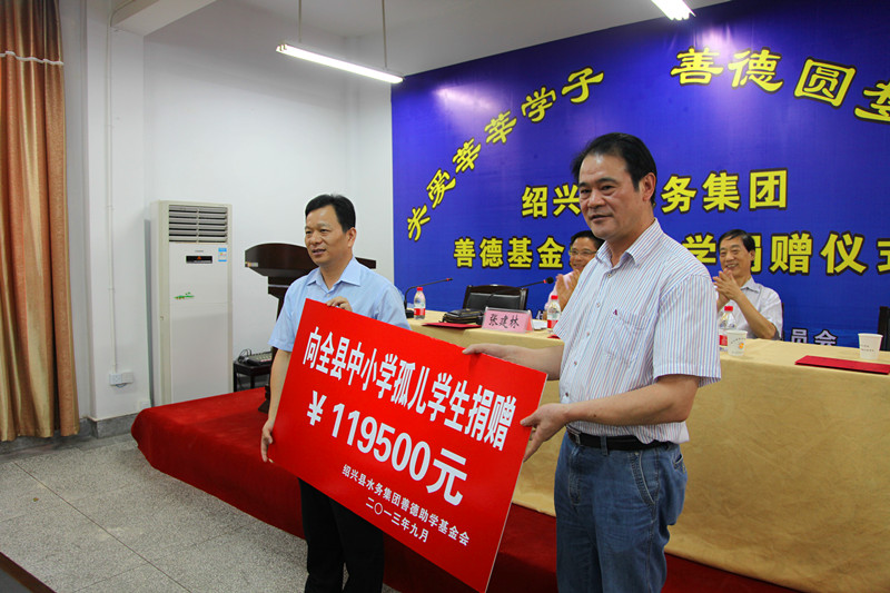 儀式上,集團倪董事長介紹了“善德基金”基本情況,并現(xiàn)場向今年受助的全縣81名中小學孤兒學生捐贈了“善德基金”助學款119500元,資助標準為小學生每人每學年1000元,初中生每人每學年1500元,高中生每人每學年2000元,并從今年開始對全縣孤兒從小學到高中讀書期間每年給予捐助。縣教體局局長蔣國洪以及縣老領導、縣關工委主任李會鵬分別作了講話,他們對集團強烈的社會責任感以及情系困難學生的善心義舉給予了高度的肯定和贊揚,希望受助學生學會堅守,學會感恩,學會奉獻,并呼吁社會各界為孩子們快樂成長、展翅高飛而共同努力。