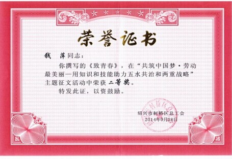 由柯橋區(qū)總工會舉辦的“共筑中國夢 ·勞動最美麗----用知識和技能助力五水共治和兩重戰(zhàn)略主題征文比賽中,濱海供水公司錢萍同志的《致青春》榮獲二等獎。