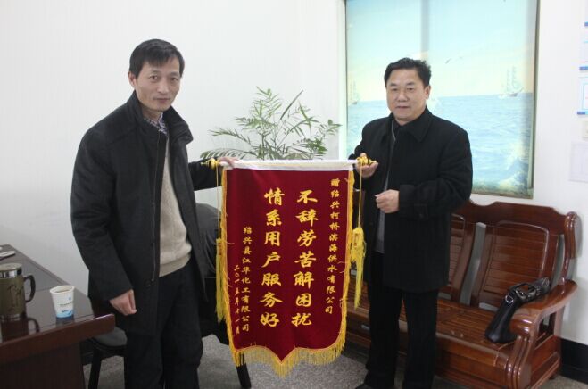 11月30日,紹興江華化工有限公司負責人來到公司,送來 “不辭辛勞解困擾,情系用戶服務好”的錦旗,對濱海供水公司長期以來為企業解決難題,營造良好的供水環境,提供高效的服務支持過程中表現出來的管理高水平、人員高素質、工作高效率表示深深感謝。