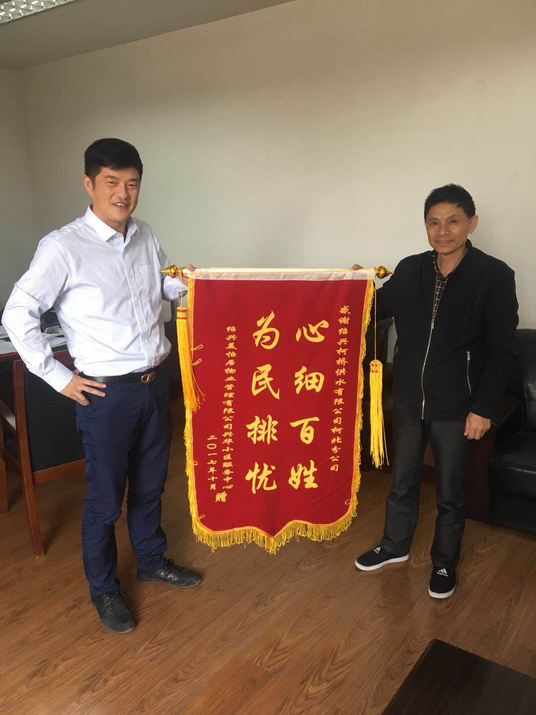 10月24日,華舍街道紹興美怡居物業(yè)管理有限公司興華小區(qū)服務(wù)中心負(fù)責(zé)人專程送來(lái)錦旗,感謝柯北分公司向他們提供優(yōu)質(zhì)高效的服務(wù)。